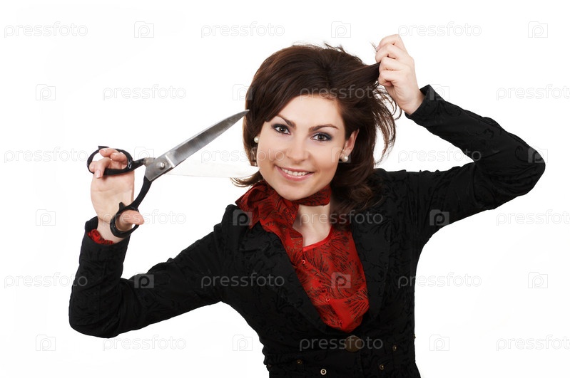 Женщина с ножницами, собирается стричь челку