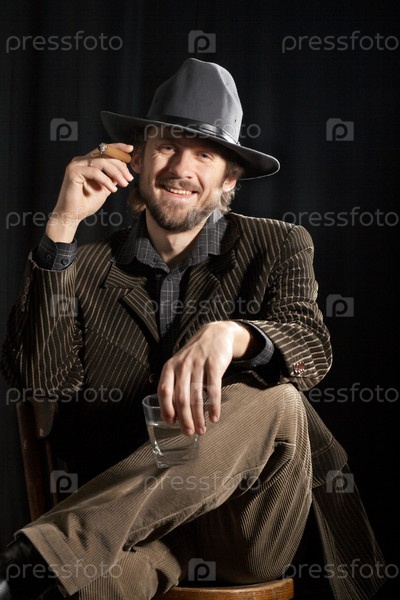 Бородатый человек в серой шляпе с бокалом виски и сигарой