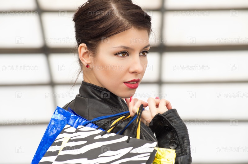 Портрет красивой европейской темноволосой женщины с яркими пакетами