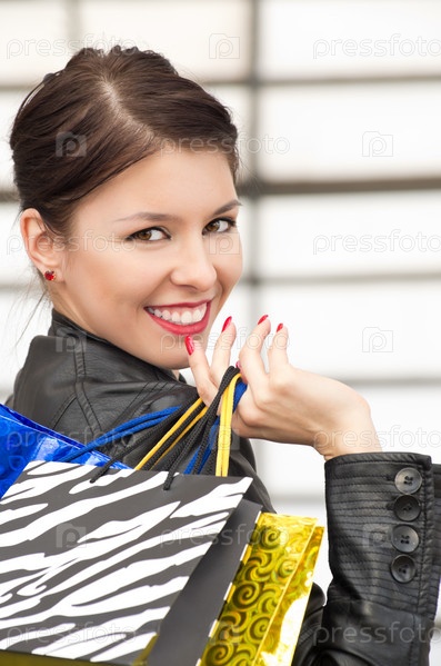 Портрет красивой европейской темноволосой женщины с яркими пакетами