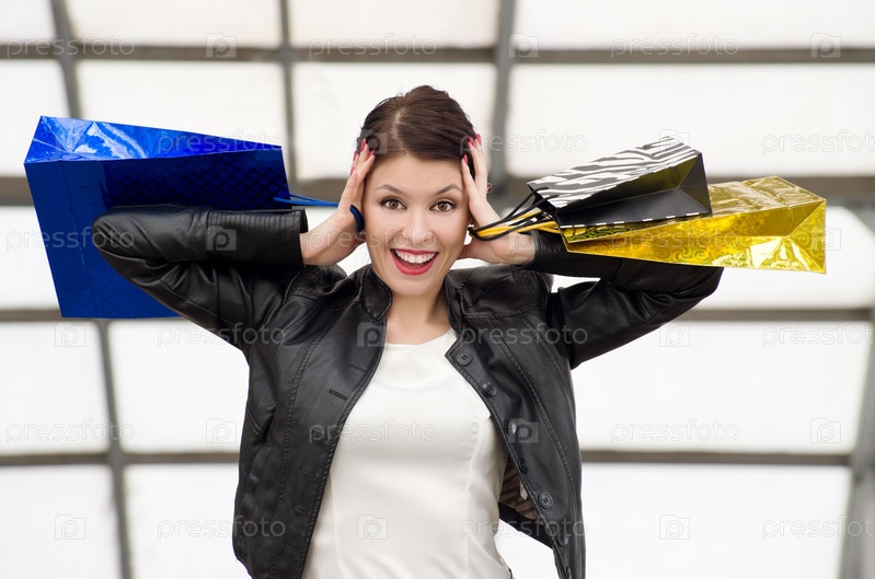 Портрет красивой европейской темноволосой женщины с яркими пакетами