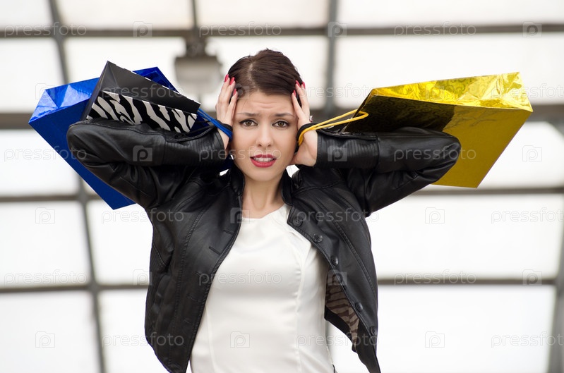 Портрет красивой европейской темноволосой женщины с яркими пакетами