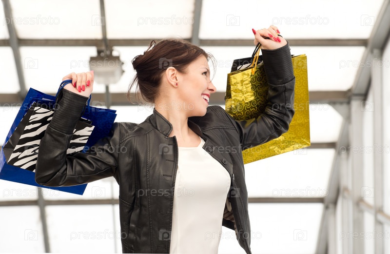 Портрет красивой европейской темноволосой женщины с яркими пакетами