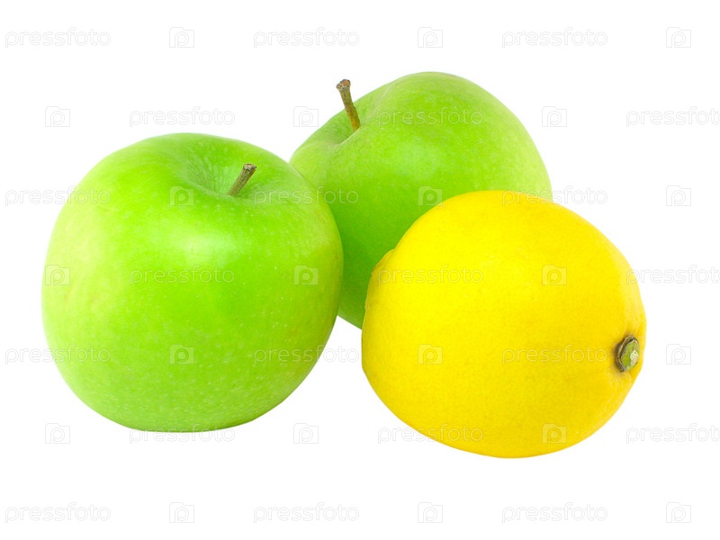 Lemon and two green apples close up on a white background; Лимон и два зеленых яблока крупным планом на белом фоне
