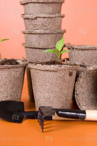 Торфяные горшки, саженцы и садовый инвентарь на коричневом фоне