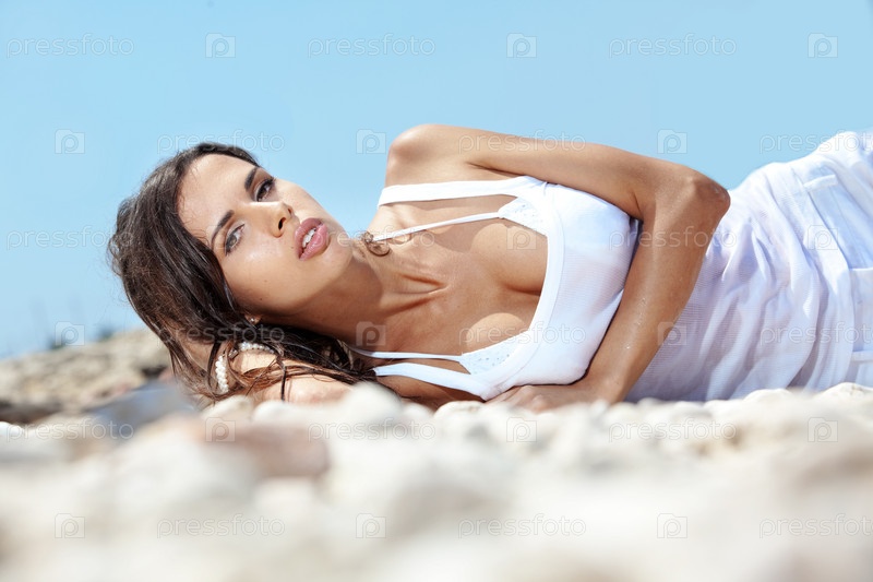 Портрет красивой стройной женщины с золотым загаром, отдыхающей на пляже летом