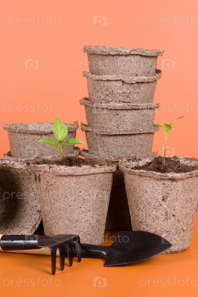 Торфяные горшки, саженцы и садовый инвентарь на коричневом фоне
