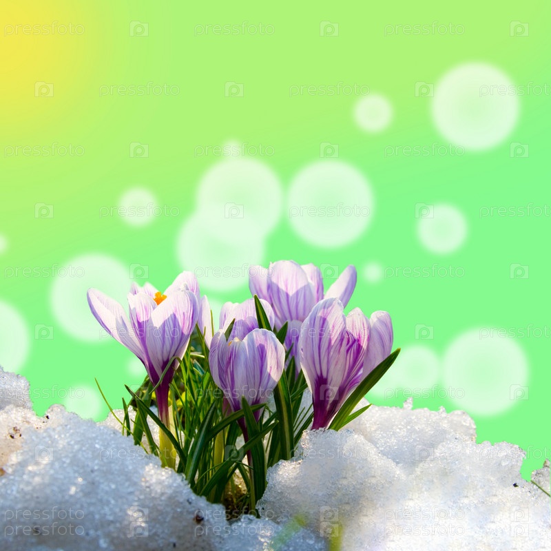 Цветущие крокусы на снегу на зеленом абстрактном фоне