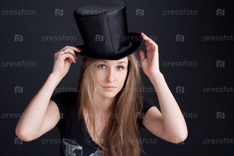 Красивая девушка в черном цилиндре на темном фоне