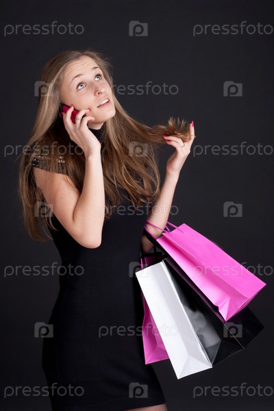 Девушка с покупками говорит по мобильному телефону