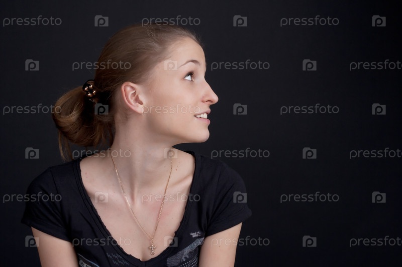 Улыбающаяся девушка сидит в профиль в студии