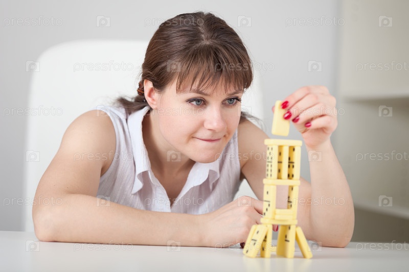 Красивая молодая женщина строит башню из домино на столе