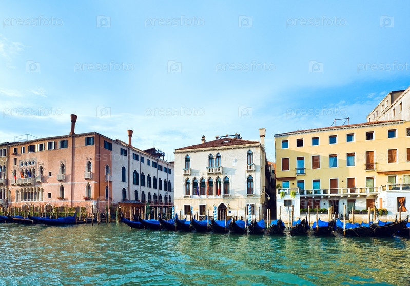 Красивый летний вид Гранд канала с гондолами на воде. Венеция, Италия