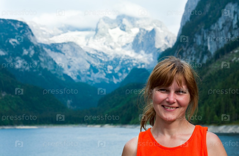 Женщина на фоне мирного летнего альпийского горного пейзажа
