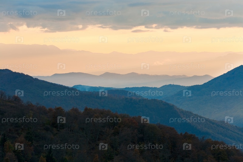 Последние отблески солнечного света и зарево в небе над осенними горами