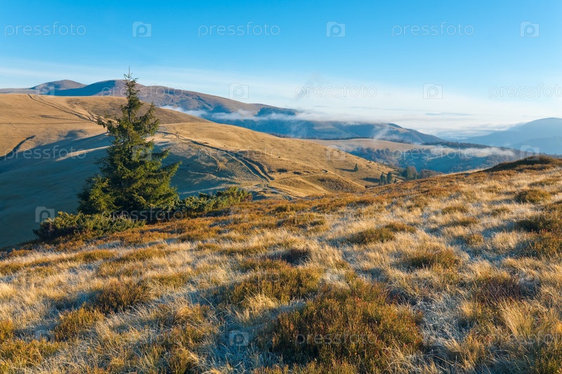 Проселочная дорога в осенних Карпатских горах утром, Украина