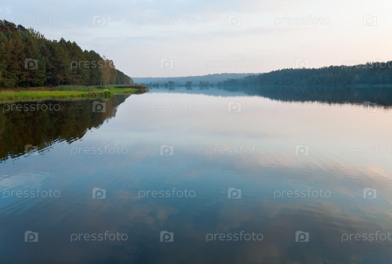 Туман над озером и осенняя роща на берегу