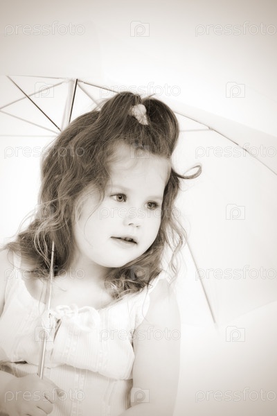 Симпатичная девочка в белом платье с зонтиком