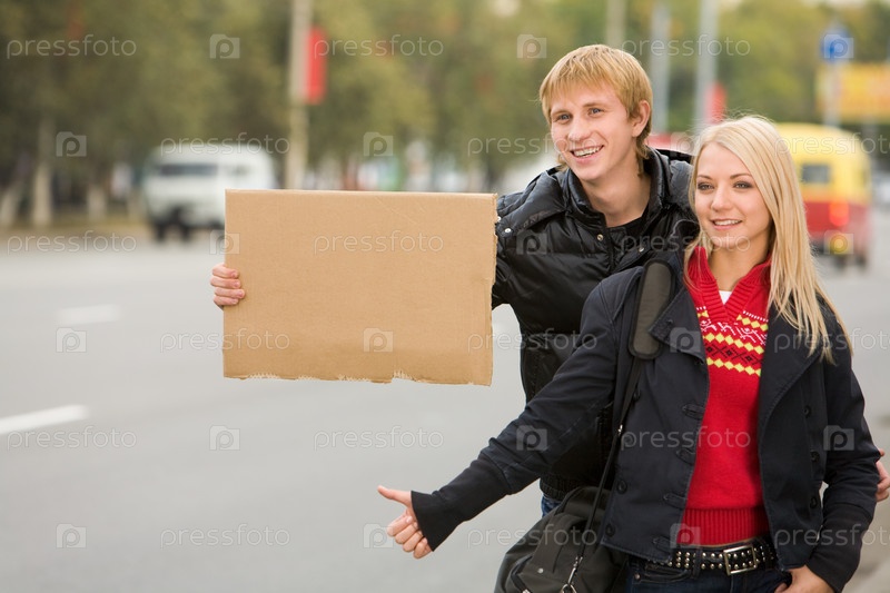 Фото красавицы и красивого парня, стоящих на автостопе по городской дороге
