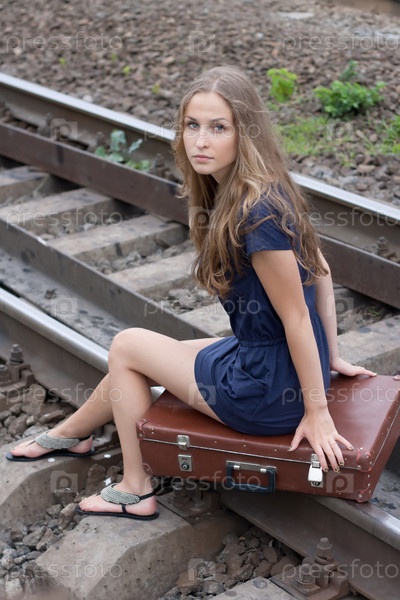 Девушка сидит на рельсах с чемоданом