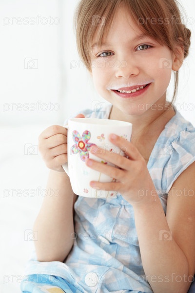 Ребенок пьет молоко в постели