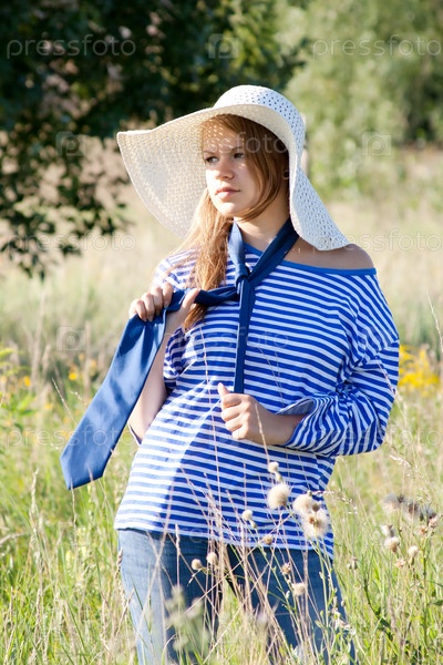 Красивая девушка в футболке стоит в траве