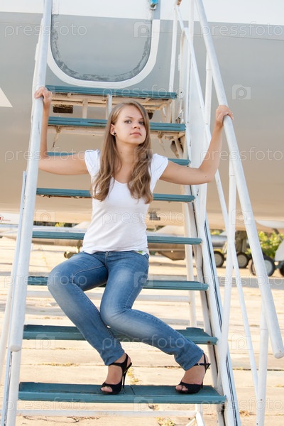 Красивая девушка на фоне самолета на экскурсии в музее