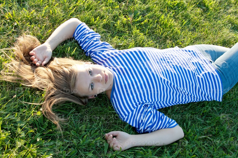 Красивая девушка в футболке лежит на траве на свежем воздухе