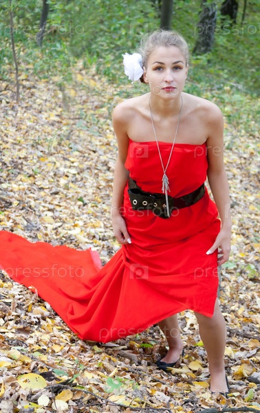 Девушка в красном платье в осеннем лесу