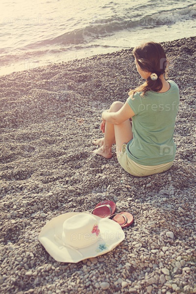 Девушка, шляпа и шлепанцы на берегу моря