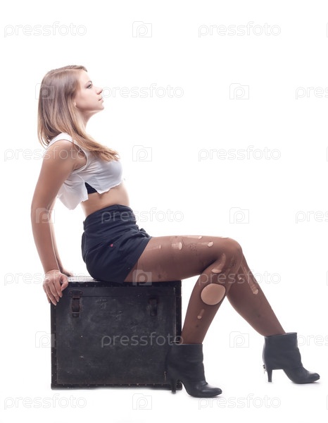 Красивая девушка сидит на ящике в студии