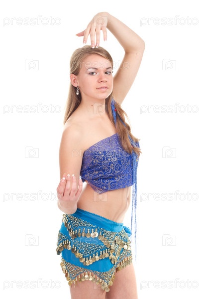 Красивая блондинка исполняет арабский танец в студии