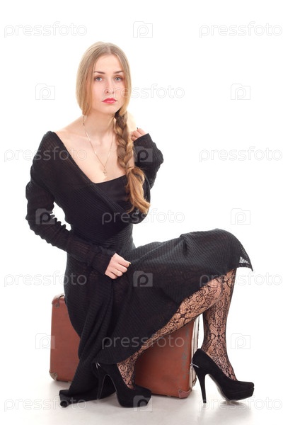 Красивая девушка сидит на чемодане в студии