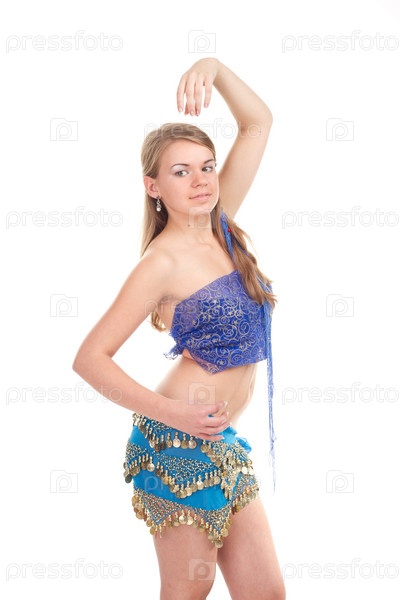 Красивая блондинка исполняет арабский танец в студии
