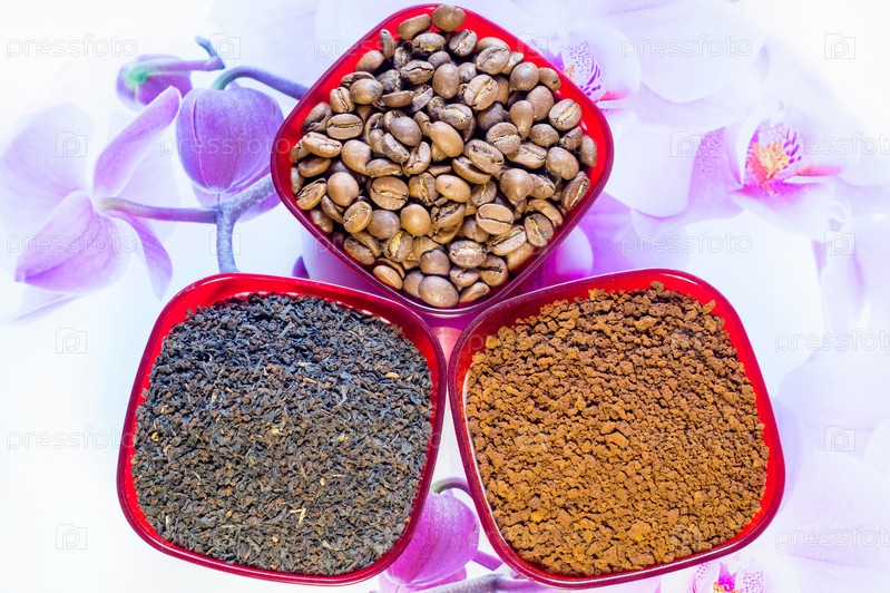 Черная заварка чая, кофе в зернах и растворимый кофе