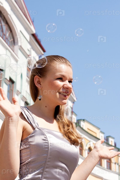 Портрет девушки с мыльными пузырями на фоне зданий и неба