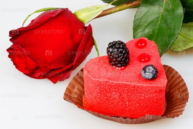 Пирожное с ежевикой и красная роза на белом фоне