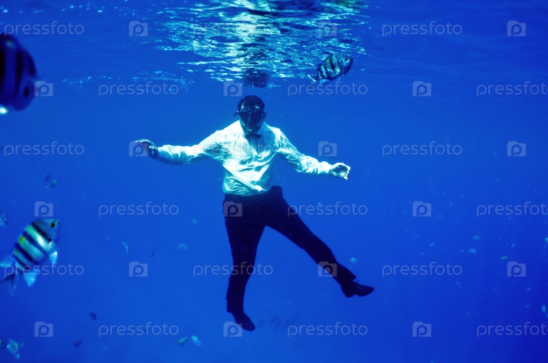 Мужчина в черных брюках, белой рубашке и галстуке на дне синего моря, окруженный блестящими рыбами