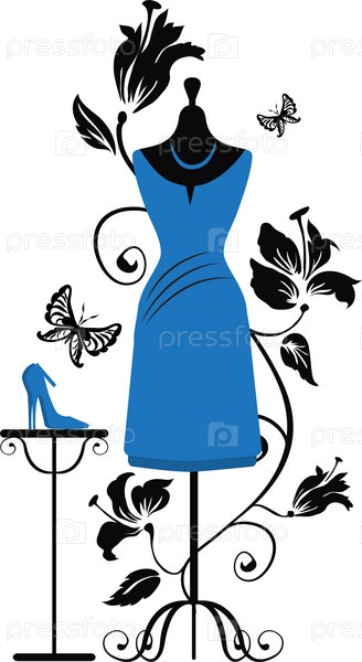 Манекен с платьем и туфли на цветочном фоне
