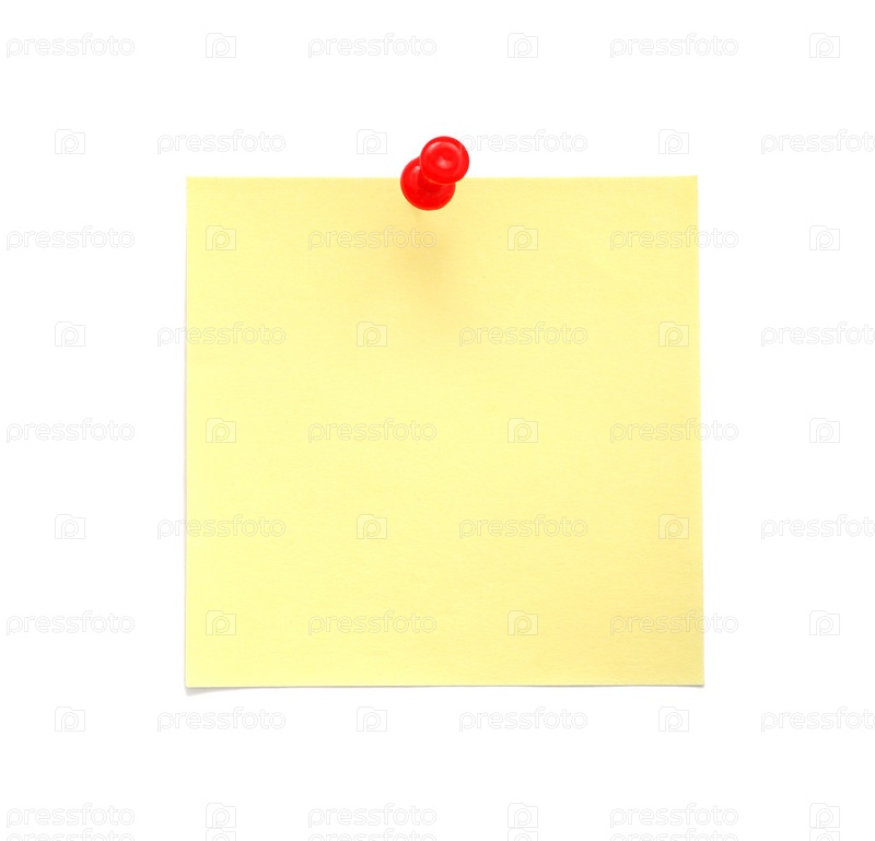 Пустой желтый лист бумаги для записей с красной кнопкой, изолированный на белом фоне