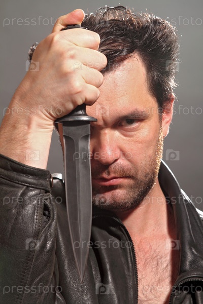 Солдат держит в руке кинжал с черным лезвием