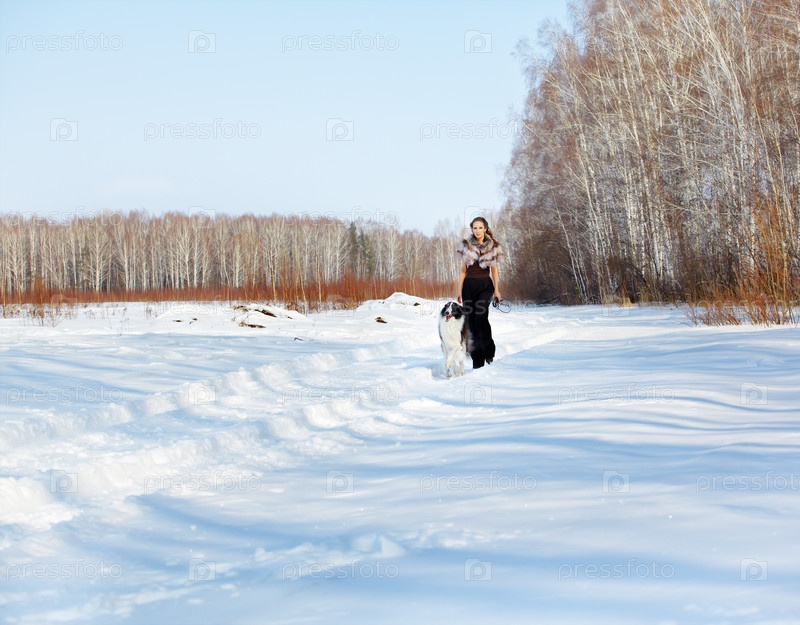 Красивая брюнетка с русской борзой в лесу снежной зимой