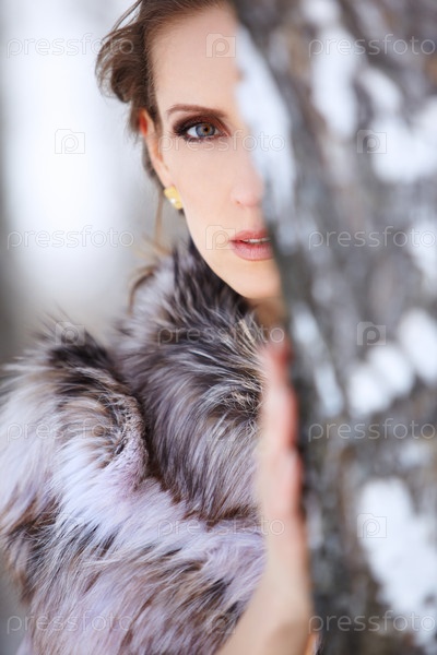 Красивая брюнетка у березы в лесу снежной зимой