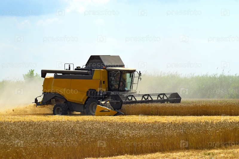 Комбайн собирает урожай пшеницы