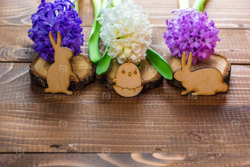 Красивые цветы гиацинты и деревянные пасхальные украшения