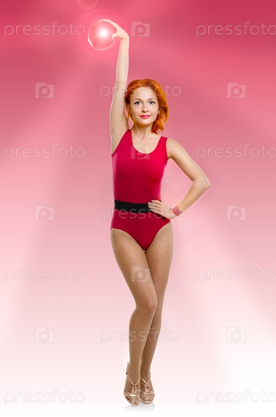 Стройная спортивная женщина с сияющим шаром для фитнеса на розовом фоне