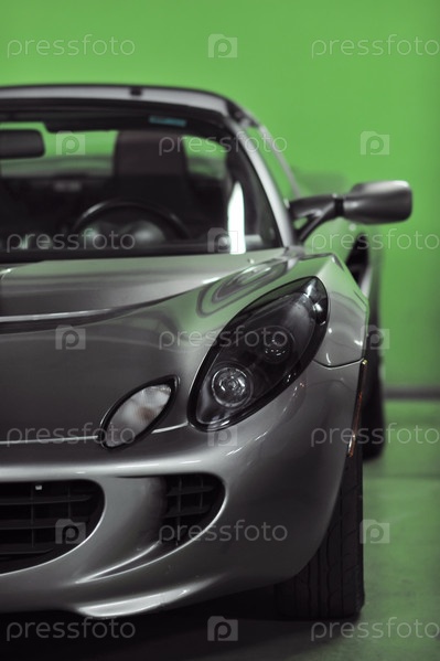Фрагмент спортивного серебристого автомобиля на зеленом фоне
