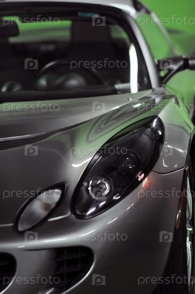 Фрагмент спортивного серебристого автомобиля на зеленом фоне