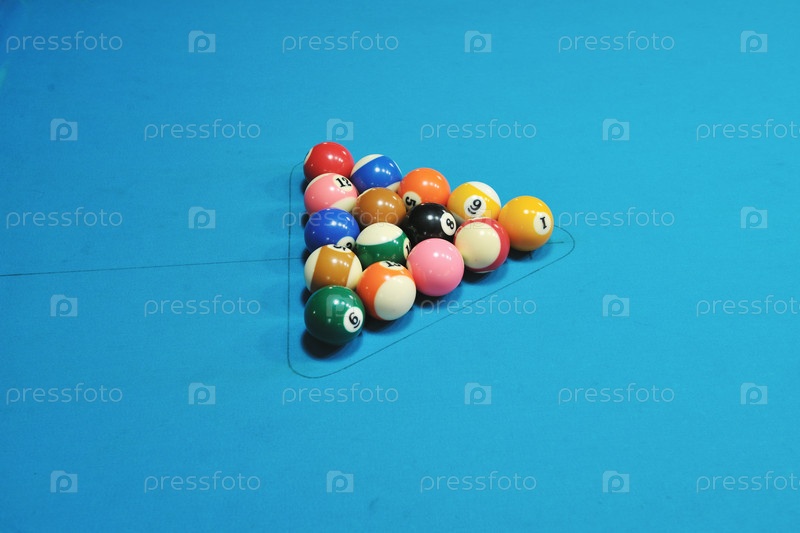 Бильярдные шары, подготовленные для игры, на синем столе в бильярдном клубе