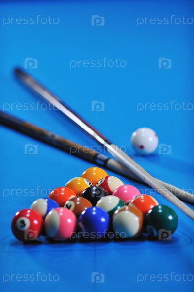 Бильярдные шары и кии, подготовленные для игры, на синем столе в бильярдном клубе